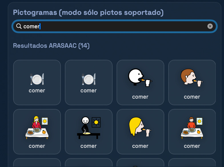 Integramos la API de ARASAAC (Centro Aragonés para la Comunicación Aumentativa y Alternativa) directamente en la plataforma. Esto permite a cualquier usuario buscar e insertar pictogramas sin salir del entorno. (Increíble)